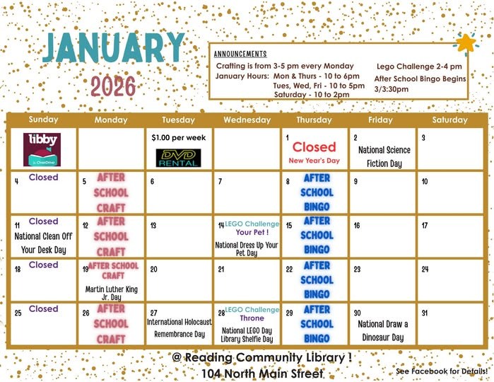 Notice: The next Reading Community Library board meeting is scheduled for Tuesday, February 3rd, 2026 at 9:00 a.m.