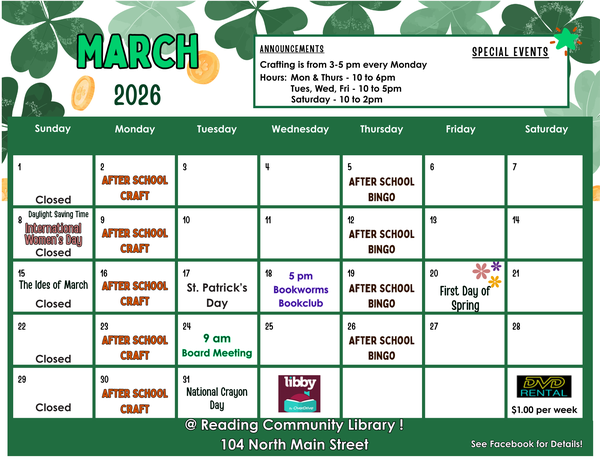 Notice: The next Reading Community Library board meeting is scheduled for Tuesday, March 24th, 2026 at 9:00 a.m.