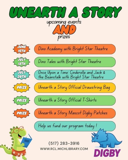 Summer Reading is upon us, and the dinosaurs are creeping in. In "Unearth a Story", children will learn about the disciplines of paleontology and archeology. Learn about fossils and dinosaurs at our events and crafts all while reading for prizes! Stay tuned for more information as the months pass by!